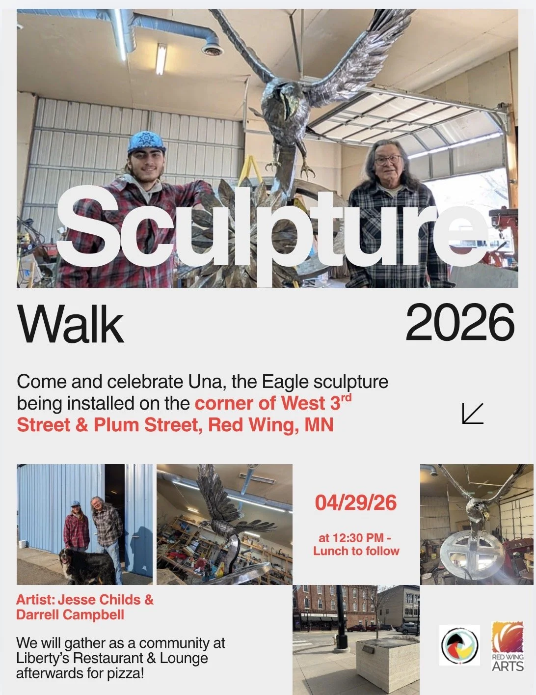 We are so excited for the new sculpture installation of Una, The Eagle created by Prairie Island tribal members Darrell Cambell and Jesse Childs. We welcome all community members from Prairie Island and Red Swing to come celebrate with us on this exciting new sculpture in our beautiful homelands.